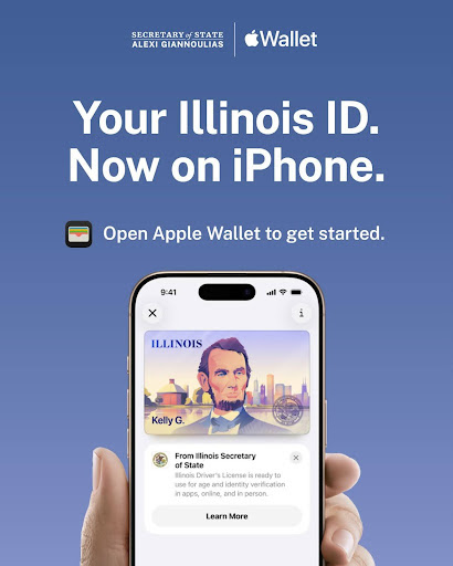 Illinoisans can now add their driver’s license or state ID to their Apple wallet on iPhone and Apple Watch. Available now, you can present it in person, online, and in-app at select businesses, organizations and airports. For more information or for some frequently asked questions, click here.