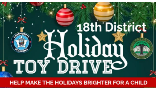 - 18th Police District: Now through December 10th, the 18th Police District is collecting new toys, coats, scarves, hats, and school supplies for the youth ages from 5-17 in the community. Drop off is at the 18th District Lobby (1160 N. Larrabee Chicago, IL). For more information, call 312-472-5578.