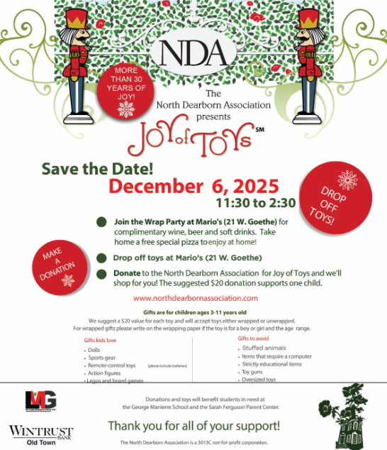 The North Dearborn Association is hosting its 32nd Annual Joy of Toys on Saturday, December 6, from 11:30 am – 2:30 PM at Mario’s Table (21 W Goethe St). Donate toys and enjoy complimentary refreshments (wine, beer, and soft drinks) while you’re there. Donate online here.